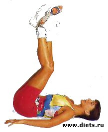 Упражнение для нижних, глубинных мышц живота. Голову прижмите к полу. Скрестите ноги и вытяните вверх. Руки положите вдоль корпуса и обоприте об пол. Таз немного приподнимите и затем опустите. Проделайте 3-5 раз. Вначале может быть довольно трудно.