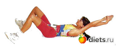 Упражнение для верхних мышц живота: лежа на спине, поставьте ноги, согнув их в коленях, и приподнимите пятки. Руки вытягиваем назад (фотография вверху) либо подкладываем их под голову (фотография внизу). Приподнимите корпус так, чтобы плечи оторвались от пола. Упражнение делайте медленно 10-12 раз.