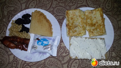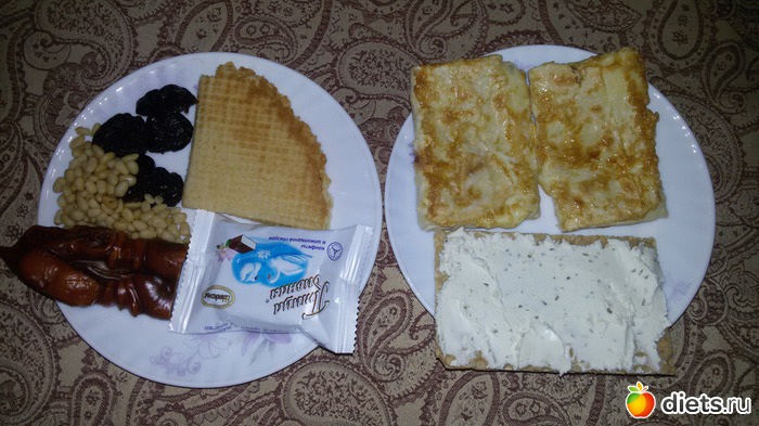 2 пирожка из лаваша с сыром, хлебец с творожным сыром, кусочек чурчхелы, вафелька, конфетка, чернослив и кедровые орешки. Зеленый чай.