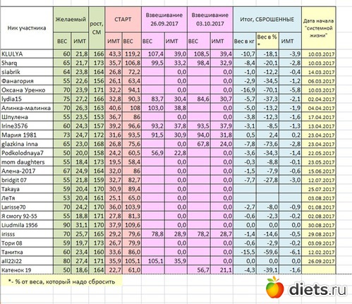Diets.ru Таблица веса участников группы за 03.10.2017