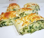 Шпинат немного протушить на сковороде для мягкости. Смешать с тертым сыром, йогуртом/творожком, горчицей. Добавить соль, специи по желанию. Распределить начинку по лавашу и скрутить рулетом. Смазать желтком или перепелиным яйцом и чуть совсем присыпать сыром.