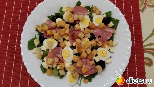 А вообще, я такой салат делаю на праздник в форме для торта, у которого бока растёгиваются. Но там порция большая получается.