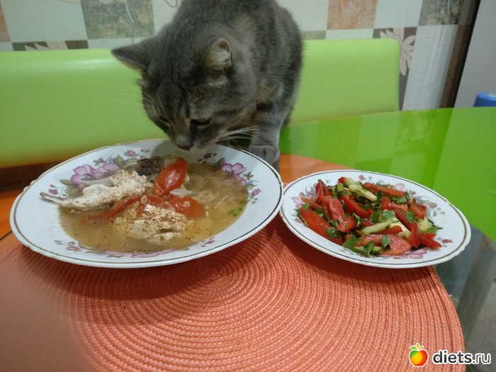 Вчерашний белковый был сытным: супчик на курогрудке, с капустой и перцем, много специй. Свежий салат из овощей.
