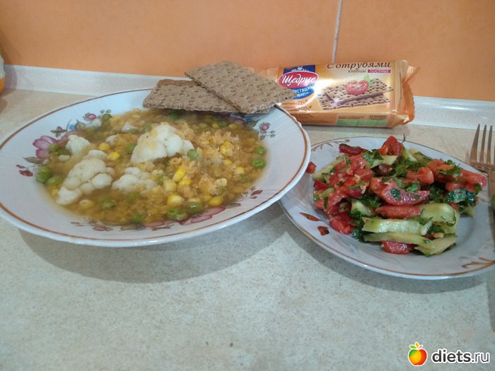 Обед: суп из красной чечевицы, цвет.капусты, кукурузы и зелёного горошка - вкусно получилось. Салат. Два любимых хлебца.