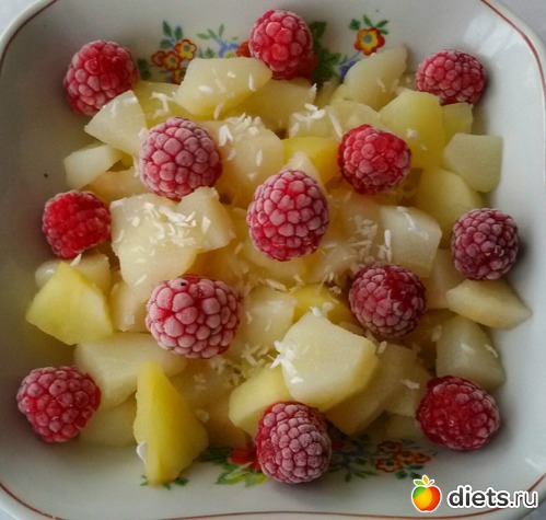 Яблоко, груша в свч, малина. Не было корицы, посыпала кокосовой стружкой.