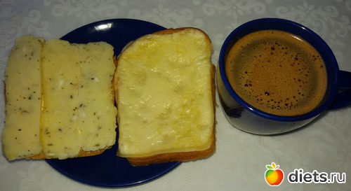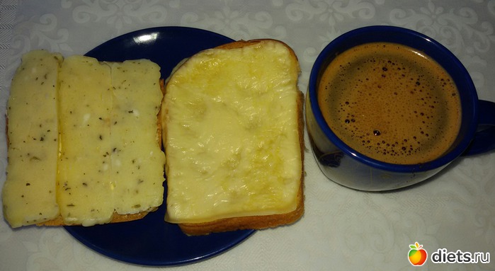 Белый хлеб и сыр, кофе. Слева - сама делала, с прованскими травами, по вкусу напоминает плавленный. Рецепт здесь