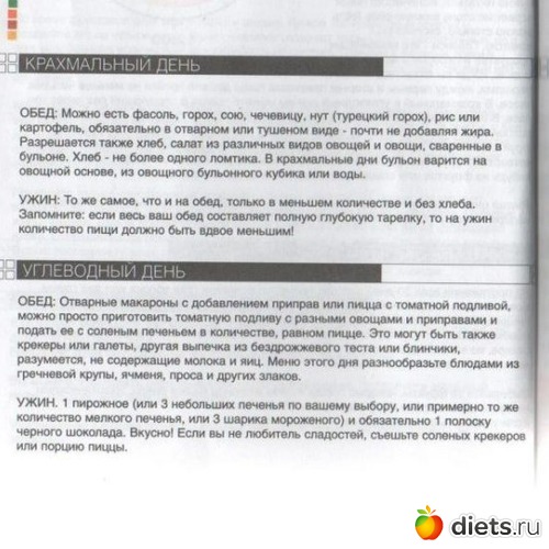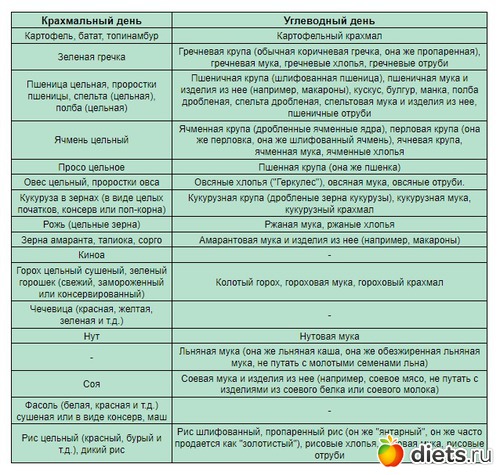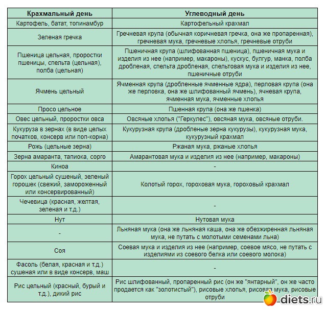 Итак, в крахмальный день нам предлагают есть все бобовые, рис и картофель; в углеводный - изделия из пшеничной муки, гречневую крупу, ячмень и просо.
