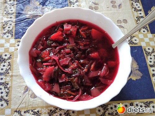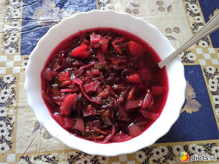 На обед рискнула приготовить себе борщ. Состоит он из свеклы, моркови, капусты, тыквы, болгарского перца, томатной пасты, зеленого лука и петрушки; варится всего пять минут (буквально) и содержит не более 30 ккал на 100 гр (это ли не чудо). Вышло вкусно.
