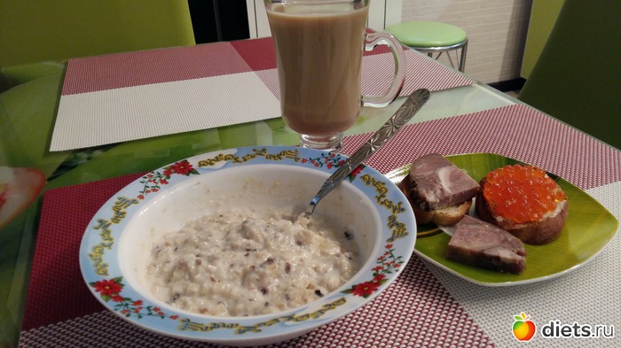 З.овсянка с черносливом+ тост(вспомнила что давно не доставала тостер) с икрой и с мясом+кофемолоко