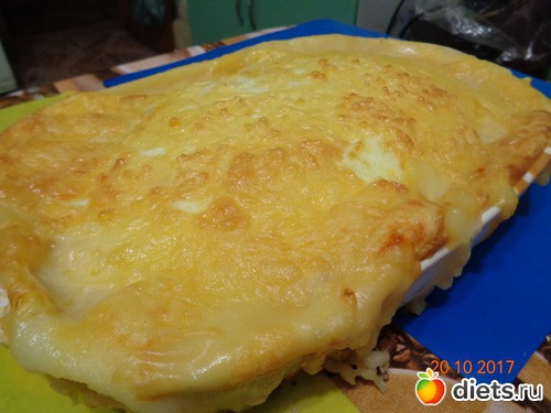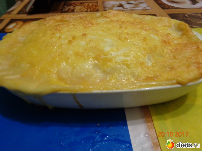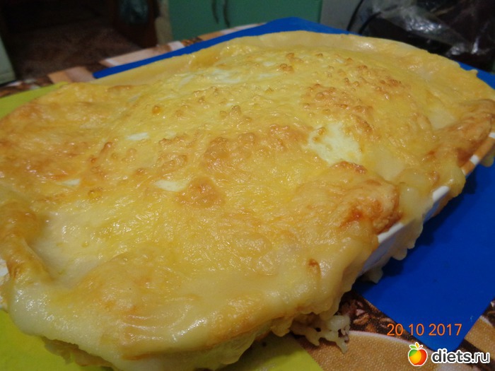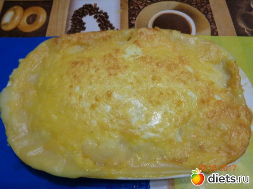 Состав: Картофель, сыр твердый, масло сливочное, молоко, фарш мясной, соевый соус, яйцо куриное — 2 шт, соль (по вкусу).