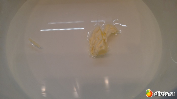 Наливаю в миску 250-300 мл воды и добавляю 10-15 грамм сливочного масла (можно заменить па 1-2 столовых ложки растительного). Нагреваю в микроволновке пока масло не растворится