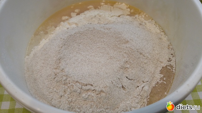 Размешиваю до полного растворения дрожжей и просеиваю муку, я брала 250 грамм пшеничной и 150 грамм ржаной