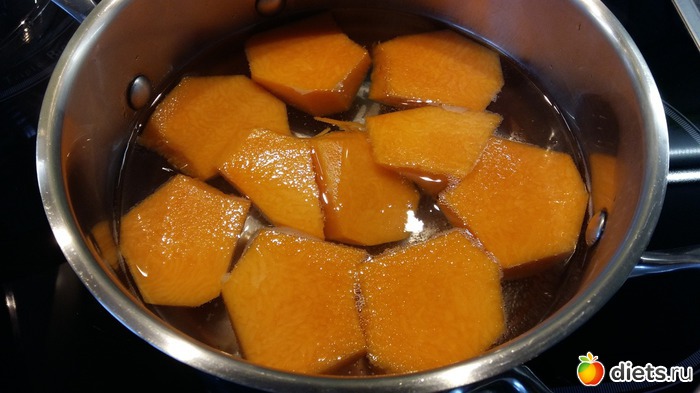 Для начала нужно сварить тыкву, я нарезала 250 грамм тыквы очищенной, залила водой и сварила на плите (около 30 минут до мягкости)