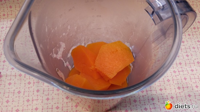 Тыкву перекладываю в стакан блендера и измельчаю в пюре (можно воспользоваться мясорубкой или обычной толкушкой)