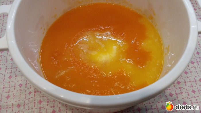 добавляю все остывшее тыквенное пюре и 50 грамм растопленного сливочного масла