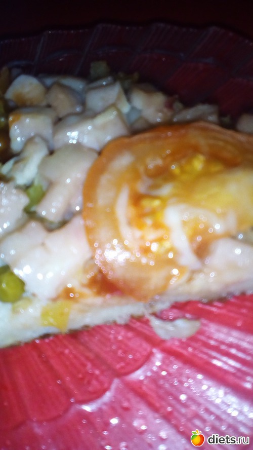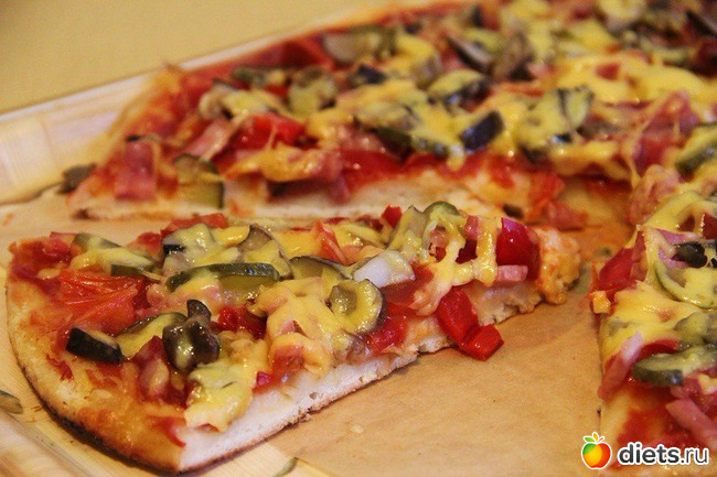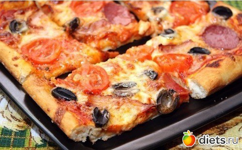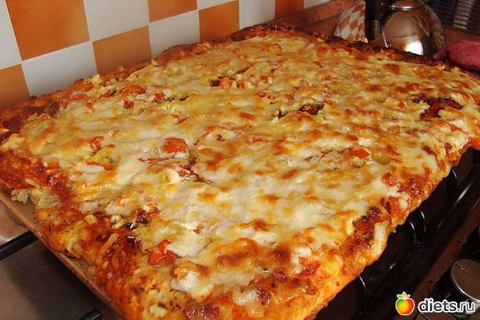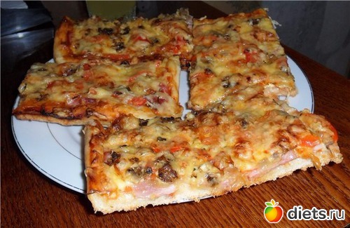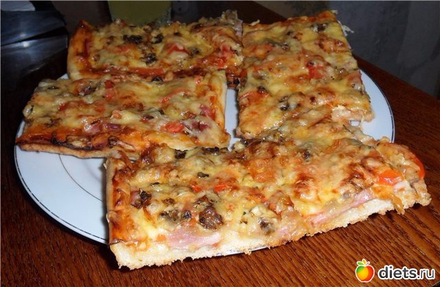 Растягиваем собравшееся тесто, так чтобы дотянуть до самых бортиков и делаем небольшие загибы по краю. Теперь смазываем тесто кетчупом и выкладываем начинку в таком порядке: лук, колбаса, грибы, перец, сыр. Сверху делаем сеточку (как можно тоньше) из майонеза и выкладываем помидоры. Запекаем 10 минут. Духовку сначала разогреть до 2300. Достаем пиццу и накрываем ее ненадолго кухонными бумажными полотенцами и даем постоять 5-6 минут. Режем на порции и украшаем петрушкой. Такая пицца в духовке, да еще и если приготовить тесто саморучно, будет вкусной и в холодном виде, и пролежит не один день (хотя это, наверное, вряд ли).