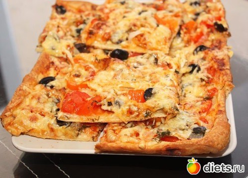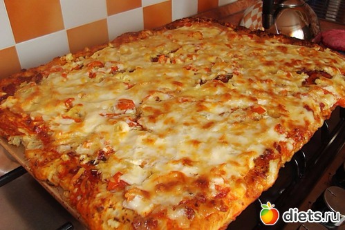 Тесто раскатываем тонко, соуса побольше. Выкладываем начинку. Ставим в разогретую до 200 градусов духовку примерно на минут 15-20, до золотистого цвета теста.