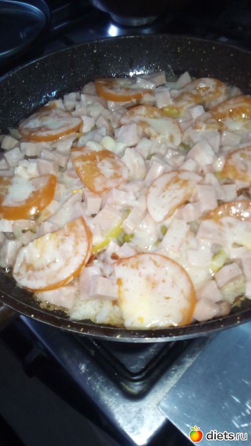 Сверху выложить колбасу, помидоры и сыр. По желанию, можете посыпать зеленью петрушки или добавить оливки, чтобы пицца приобрела более пикантный вкус. Можно добавить помидоры и несколько сортов сыра - по желанию. Смазать все майонезом и кетчупом (по вкусу и по желанию). Поставить сковороду на медленный огонь, накрыть ее крышкой и ждать, пока пицца приготовится. Проверить ее готовность можно лопаткой снизу. Следи, чтобы огонь был медленный и пицца не пригорела.