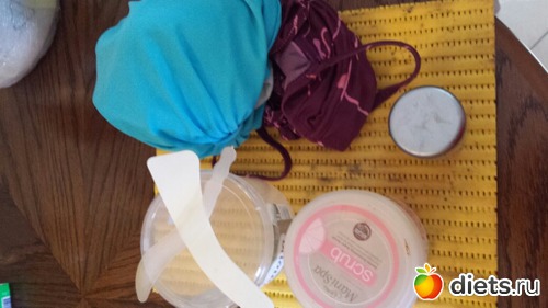 Коврик из кухни замызганый, два растянувшихся купальника, 3 банки из под крема, ушных палочек и скраба и 2 скребка.