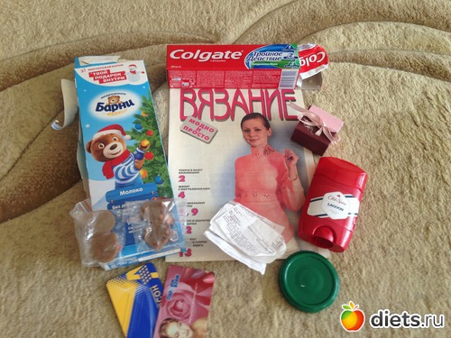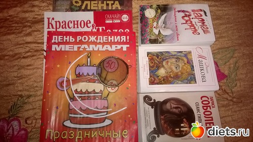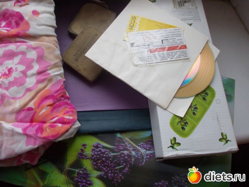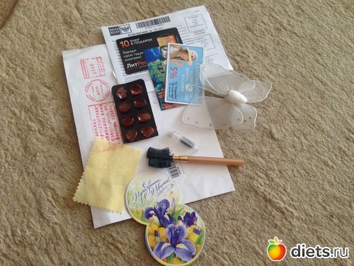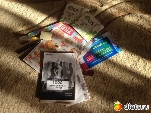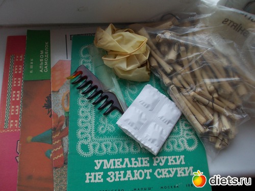 3 рекланых буклета, 3 книжки ( отдала сестре), ситечко и "косточки" ( причем одна сломанная, чего лежат