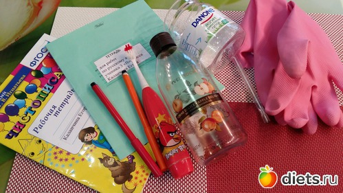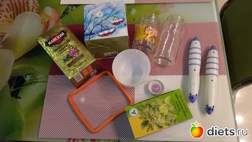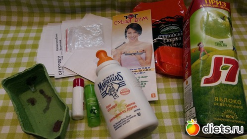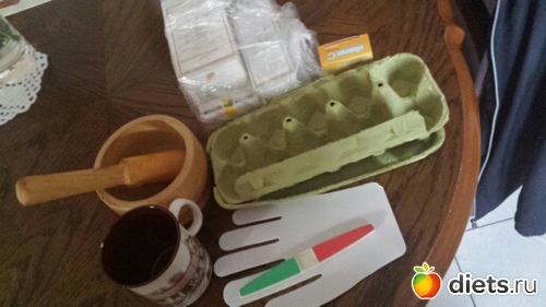 3 пакетика старой травы. Картонка от перчаток, старая пилочка, надколотая кружка, ступку на дачу ( а это считается или нет?), просроченные витаминка и коробочка от яиц.