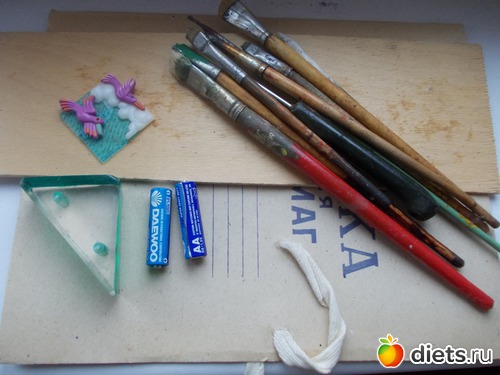 9 старых истёртых или вылезших кистей - ну, с этими-то ясно: можно в качестве палочек для размешивания красок использовать. Но зачем в таком количестве?! Ведь и палочки специальные собирала.............