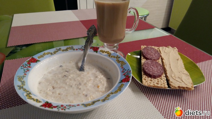 З.овсянка с черносливом+хлебец с паштетом из тунца и второй с сырокопченой оленьей колбаской+кофемолоко