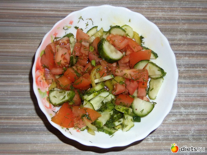 На гарнир я сделала себе простой салатик (помидор, огурец, болгарский перец, укроп, лук, чайная ложка горчичного масла).