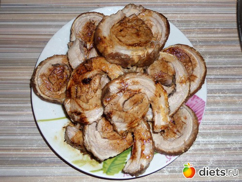 Заточила рулет из свиной грудинки, запеченный с гранатовым соусом. Готовила впервые, поэтому вышел чуть кривым.