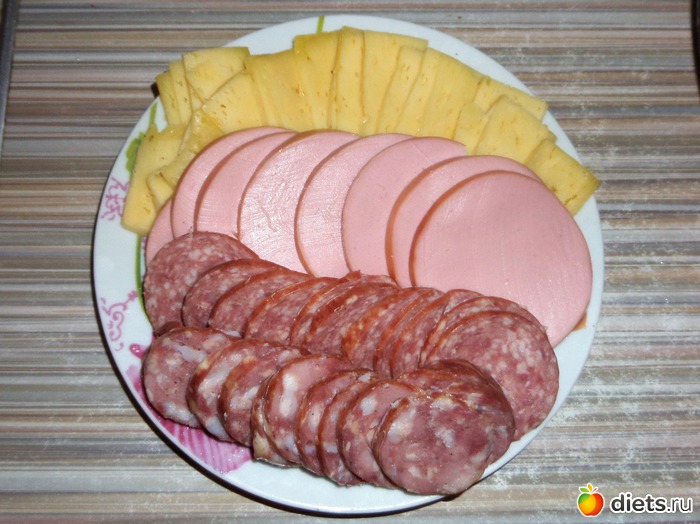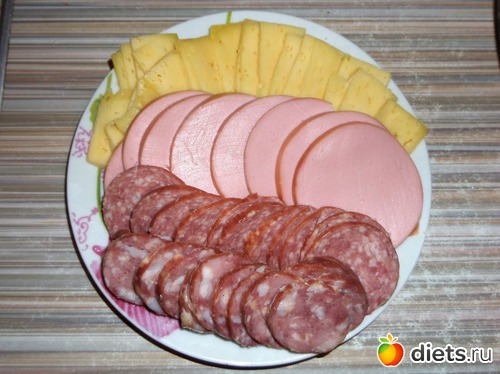 Далее меня ждала колбасная нарезка: краковская, сервелат, подкопченая варенка и голандский сыр.