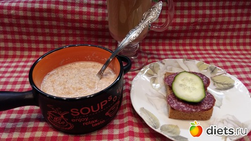 З.каша гречневая+бутербродик с оленье сырокопченой колбаской и огурчиком+кофемолоко