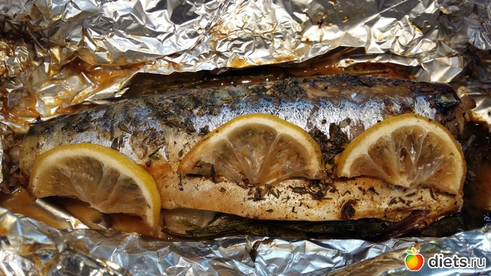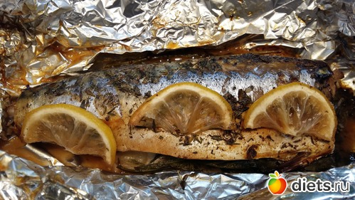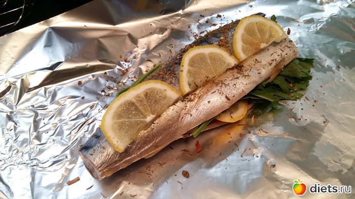 на ужин запекала скумбрию с зеленью, лимоном, чесночком и специями крымскими для рыбы