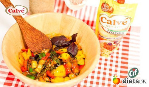 Все овощи нарежьте крупным кубиком и обжарьте по отдельности на оливковом масле, в цукини добавьте тимьян. Готовые овощи положите в миску, заправьте кетчупом Calve Неаполитанский, свежим базиликом, остудите и подавайте на стол. Украсить можно свежей веточкой базилика.