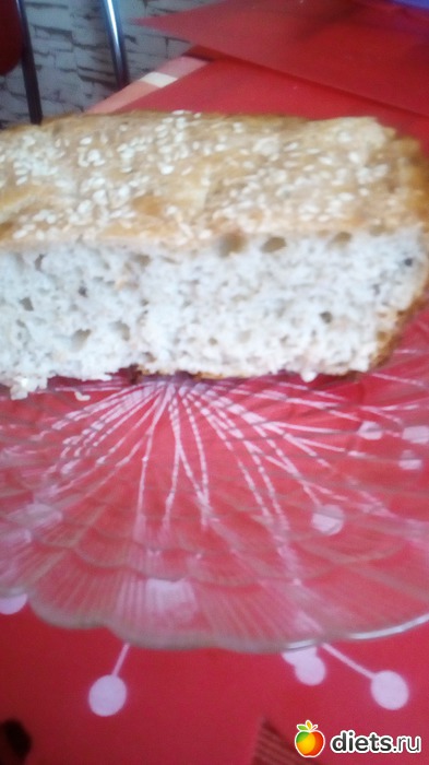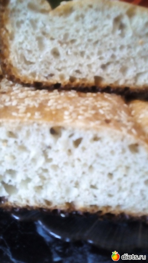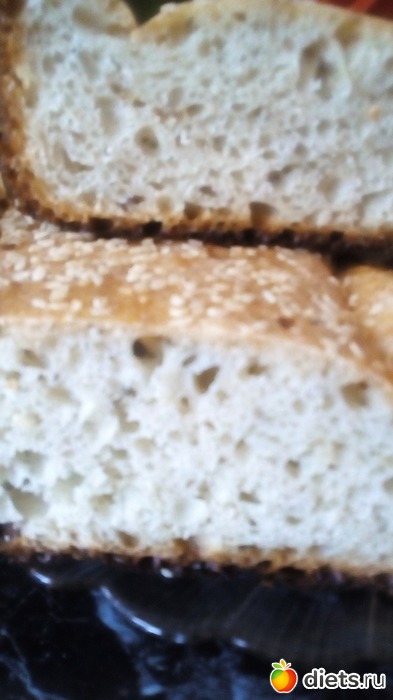 Твёрденькая корочка и плотный, пористый, слегка влажноватый мякиш присущи этому хлебу. Вкус универсальный, подойдёт к чему угодно.
