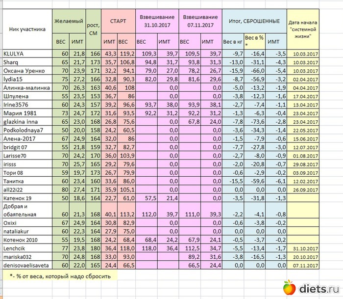 Diets.ru Таблица веса участников группы за 08.11.2017