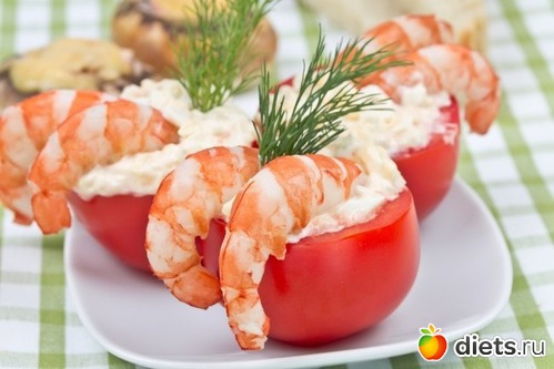 Креветки отвариваем в подсоленной воде и откидываем на дуршлаг. Чистим, удаляем головы. Хвостики можно оставить, чтобы было красивее (если креветки очищенные, задача сильно упрощается). Наполняем помидорки сливочным сыром. Это удобно делать при помощи кондитерского мешка или полиэтиленового пакета с отрезанным кончиком. Втыкаем в сыр креветку хвостиком вверх. Закуска готова.