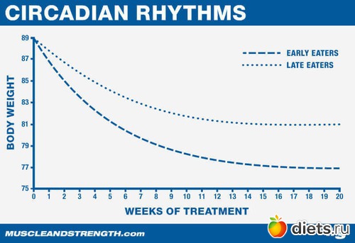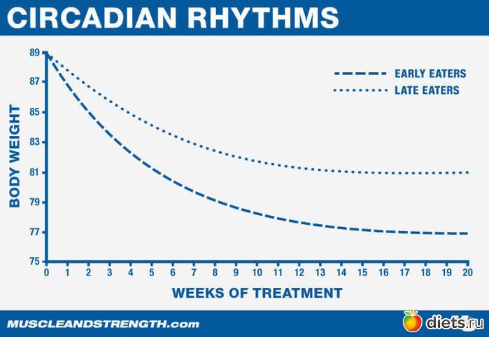 что поздний ужин снижает эффективность и шансы на успех программы похудения. Показательно, что обе группы подэкспертных обладали одинаковыми характеристиками: возраст, показатели гормонов аппетита, калораж, продолжительность сна и потребление макронутриентов совпадали. Как показано ниже, несмотря на идентичные исходные данные, подэкспертные, основную часть пищи потреблявшие до 15.00, похудели эффективнее, чем другие.