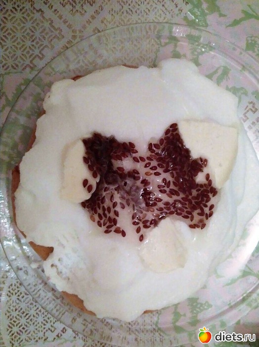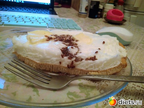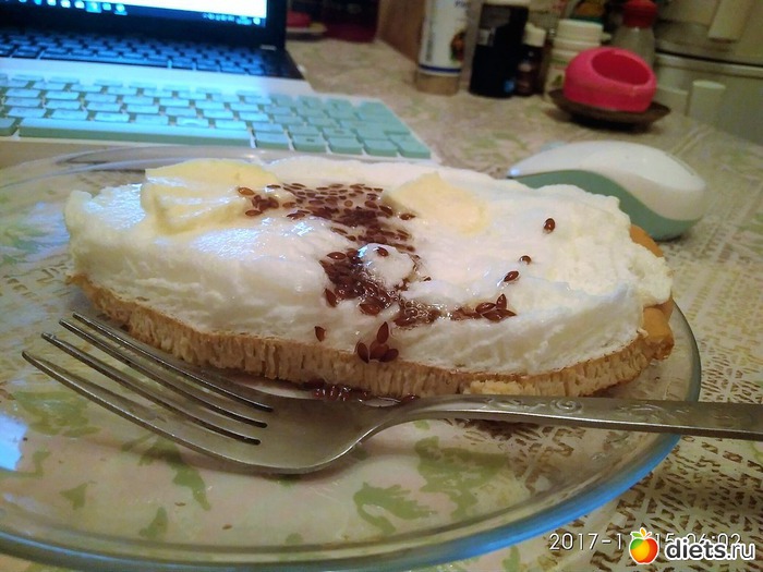 Нет, я не спятила, разве что самую малость. Просто поняла, что клетчатка и льняное семя в составе блина делают его тяжелым и сыроватым. Разделила. Теперь блин - это просто яйцо и мука, льняное семя запариваю отдельно половиной стакана кипятка и немного грею в микре. Добавляю таблетку стевии, оставляю. За ночь получается такой прикольный сопливый кисель. Можно ложкой есть, а можно полить им блин. В целом, понравилось. Вот все вместе, кстати: