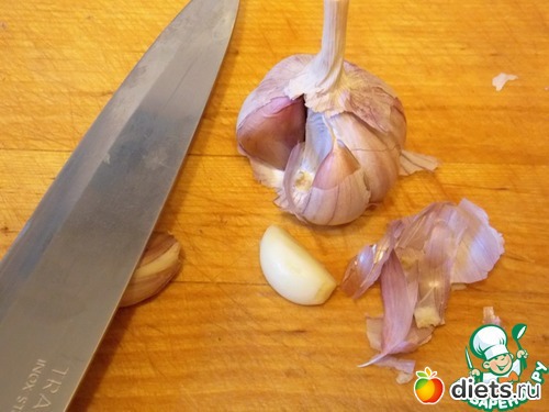 На разделочную доску кладем зубчик чеснока и широкой стороной ножа надавливаем на него. Делаем это аккуратно, до небольшого хруста, иначе Вы можете его просто раздавить. Шелуха при этом отходит сразу и остается только отрезать плотный хвостик основания.