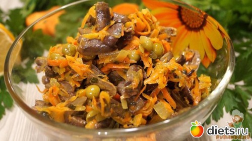 Куриные сердечки отварить на резать на 4 части. Лук обжарим с морковью. Смешаем куриные сердечки, лук с морковью, горошек, приправы.
