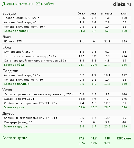 Еле набираю свои калории. Пришлось увеличить на ужин кол-во рыбы и капусты, а на 2-й ужин добавить хлебцы вместо кисломолочки - слишком много жиров, а 1% кефир в меня не лезет.