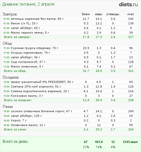 У меня по структуре чаще 20%-75%-5% выходит. Калории считать не люблю, веду дневник на diets ради того, чтобы узнать структуру)))