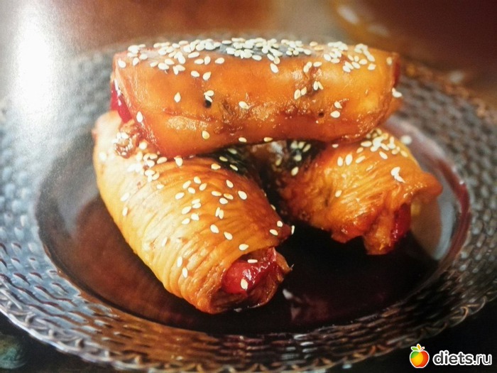 5) Смажьте чашу мультиварки маслом и выложите рулетики, посыпьте кунжутом и готовьте на программе "Мультиповар" 10 минут при температуре 160С.