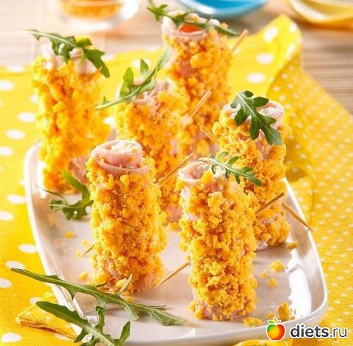 3. Каждую трубочку окунуть в майонез, затем обвалять в тертом желтке. Трубочки вертикально поставить в небольшой салатник. Украсить зеленью.