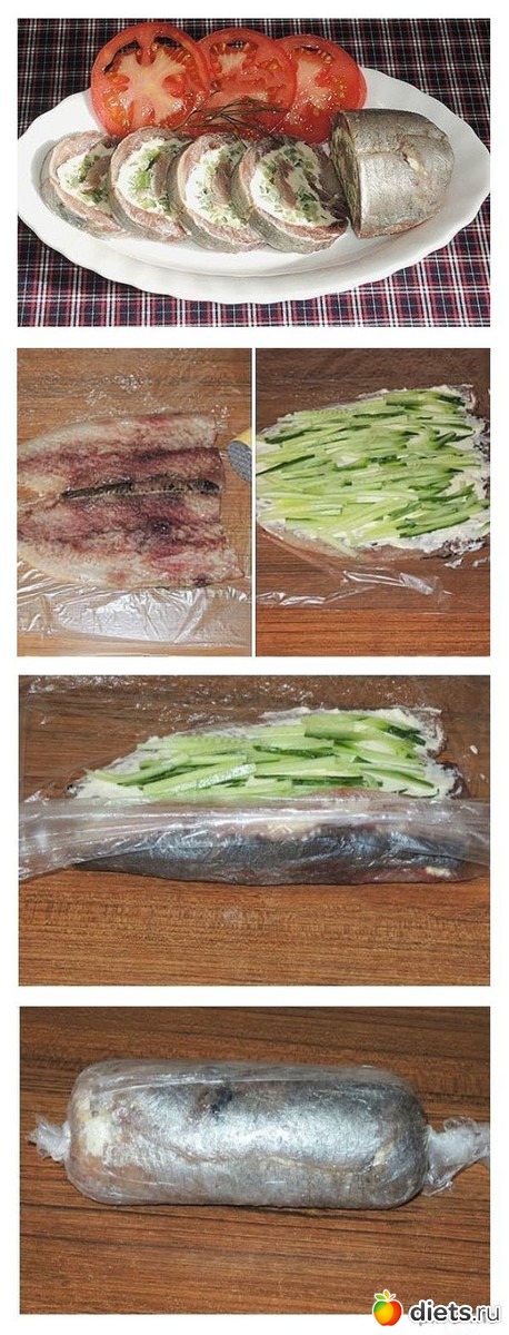 Аккуратно завернуть сельдь с начинкой в плотный рулет и убрать в холодильник на пару часов, для того чтобы он схватился и легко резался.
