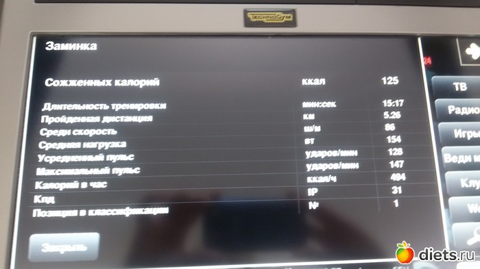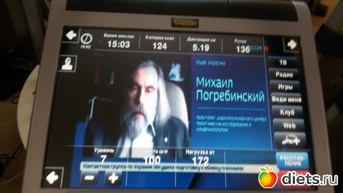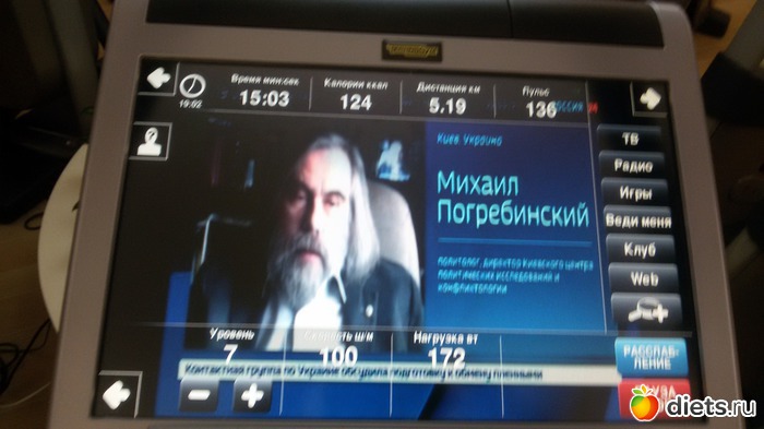 Так выглядит экран, когда ты двигаешься. Кадр получился немного смазанным, потому что пришлось фотографировать в движении. У меня сегодня на данном этапе была нагрузка 100 шагов в минуту. Я шла не держась за поручни, пульс считывался с нагрудной ленты. Можно поставить телепередачу ( 50 каналов), радио или подключить интернет.