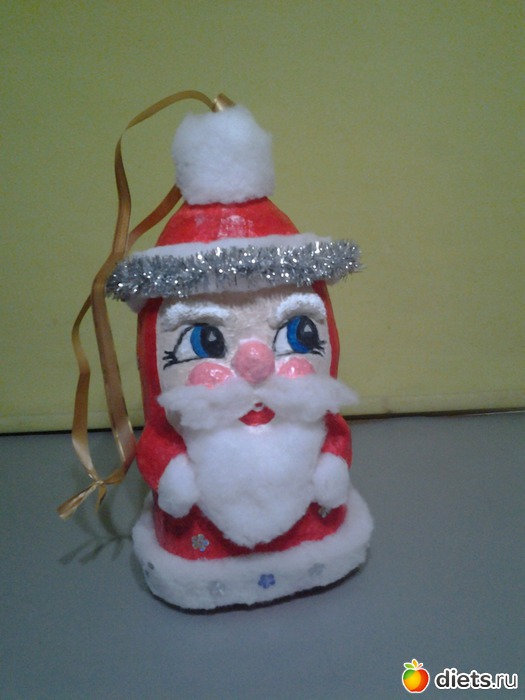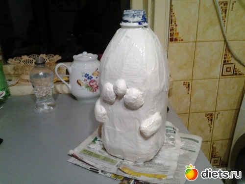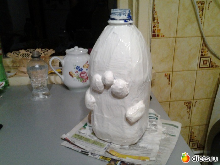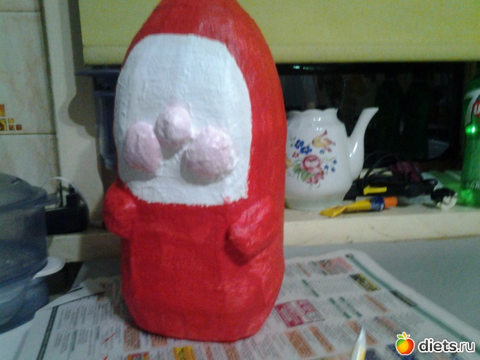 5 литровая бутылка обклеивалась газетами клеем пва ( в оригинале использывали обойный клей, у меня его не было, но я нашла в гараже пол банки пва! ) рвём газету и клеем, из туалетной бумаги и пва делаем шарики для щёк , носа и руки, приклеиваем к бутыли.