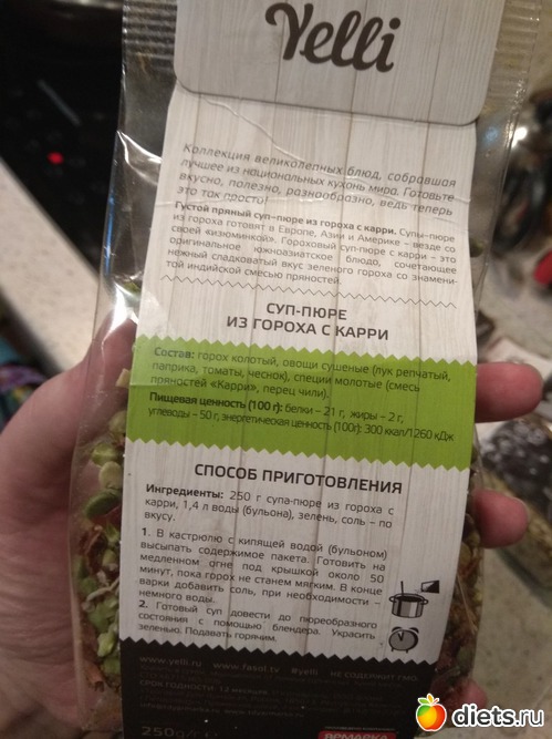 Вот состав горохового супа-пюре, который я сейчас ем. (Кроме меня есть некому. Сын обедает в саду, муж на работе). КБЖУ этого готового супа 43/3/0,3/7.