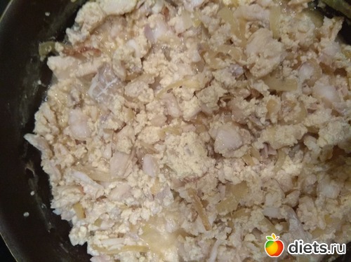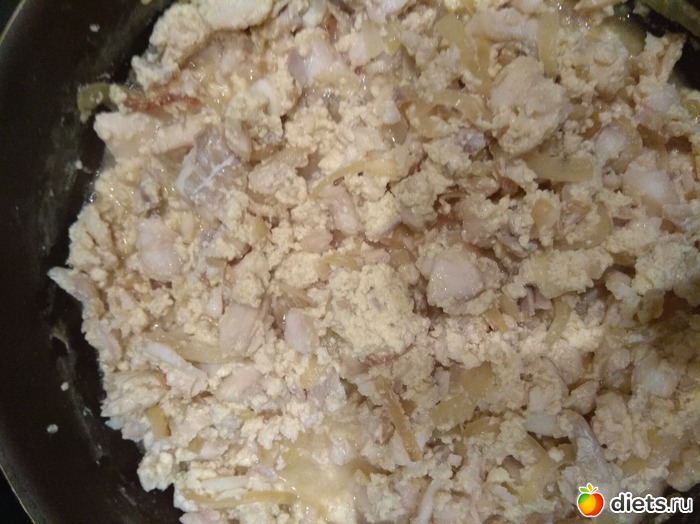 Потом залила поджаренную рыбу с луком и стала периодически помешивать (что бы было рассыпчатое, а не сплошной блин).