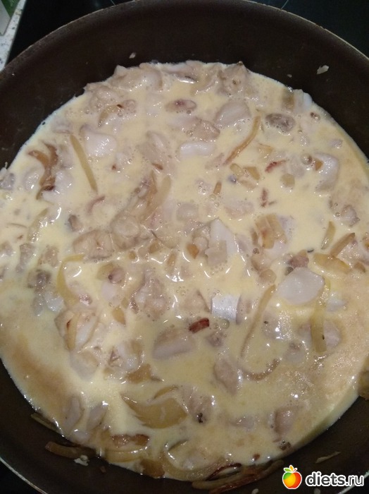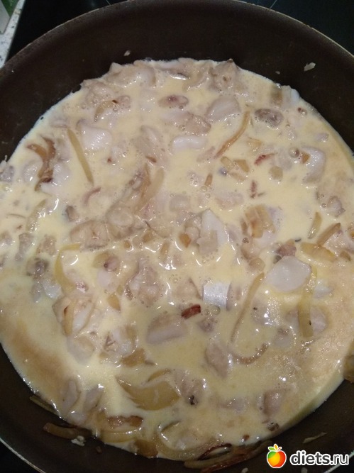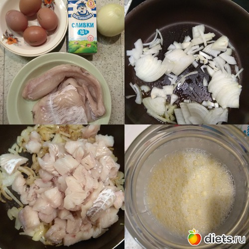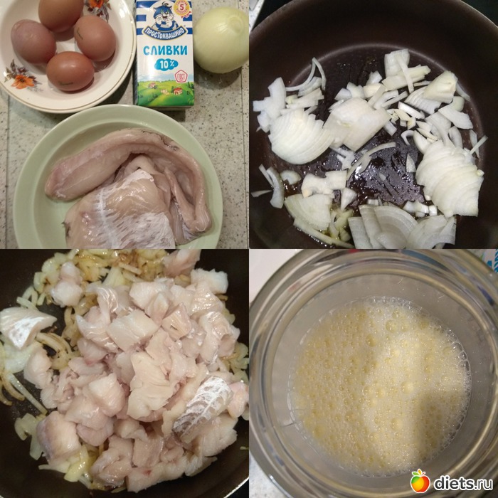 Все просто до безобразия. Берём треску (минтай), яйца, сливки, лук. Соль и немного маслица. (У меня оливковое.) Порезала лук - отправила на сковородку. Порезала рыбу любыми кубиками - все равно развалится в процессе - отправила к поджаренной у луку. Взбила яйца со сливками.